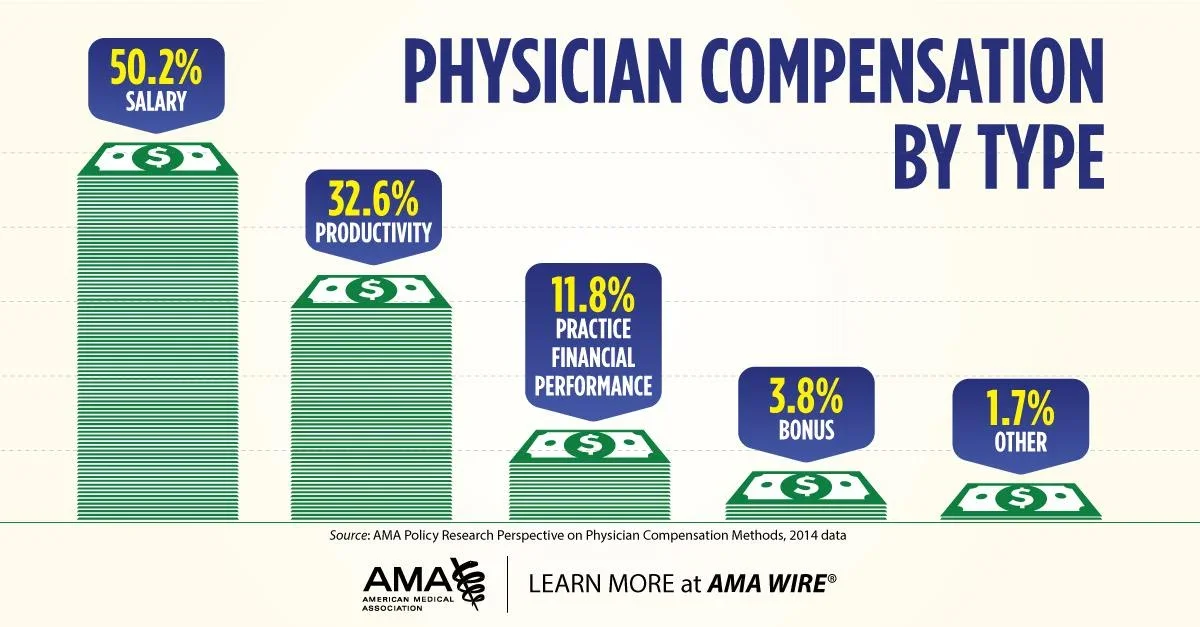 Physican Compensation: Remember, not all physicians have just a base salary, despite what we see at most job opportunities. Its important to ask what part of your “salary” has base vs productivity or RVU bonuses. We will discuss more about what RVUs mean shortly. Practice financial performance includes profit sharing from bonuses practices or hospitals receive from meeting quality metrics or participating in certain value-based care models. We will have a separate breakdown on value based care later, but beware if you participate in value-based care, depending on the type of contract and model, part of your salary may depend on “clinical outcomes” from metrics including # of colonoscopies completed, A1C <8, or even how many times your patient gets hospitalized for congestive heart failure.
